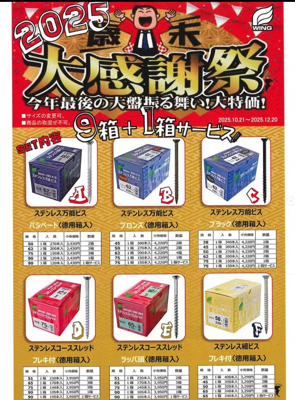 少蓋から大羅注文に対応できる種類在庫星に自信あり。 必要な物を必要なだけお選びください。 特にビスはかじ兵衛の売れ行き商品。
